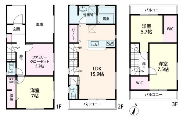 | 設備 | 都市ガス / 公営水道 / 汚水:公共下水 / 雑排水:公共下水 / ユニットバス / ユニットバストイレ / ガスコンロ 三口 / 電気:あり 設計住宅性能評価書 / 建設住宅性能評価書(新築時) / 外壁サイディング / 市街地が近い / 閑静な住宅地 / 整形地 / 都市近郊 / 平坦地 / 2沿線以上利用可 / 駅まで平坦 / 3階建以上 / 陽当り良好 / 通風良好 / LDK15畳以上 / 全居室6畳以上 / フローリング / 24時間換気システム / 全居室収納 / ウォークインクローゼット / クローゼット / シューズボックス / システムキッチン / 対面式キッチン / カウンターキッチン / グリル / 浄水器 / 浴室乾燥機 / オートバス / 浴室に窓 / 追焚機能 / 浴室暖房 / 浴室1坪以上 / シャワー付洗面化粧台 / トイレ2ヶ所 / 温水洗浄便座 / 室内洗濯機置場 / 洗濯機置場有 / バルコニー / 2面以上バルコニー / 南面バルコニー / 複層ガラス / ハイルーフ駐車場 / ビルトインガレージ / TVモニタ付インターホン / ディンプルキー / ダブルロックドア / シャッター雨戸 / 火災警報器(報知器) / スーパー 徒歩10分以内 / 小学校 徒歩10分以内 / 小学校まで1km以内 / 周辺交通量少なめ / 都市ガス |