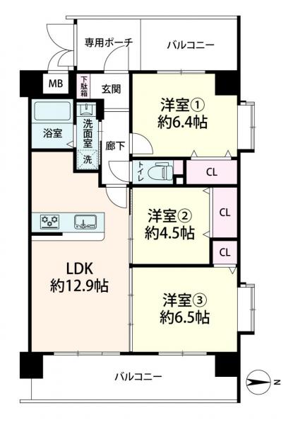 | バルコニー面積 | 16.4m2(4.96坪) 北東向き | ||
