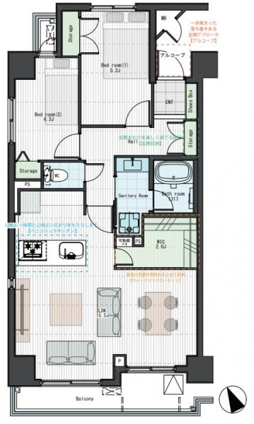 | バルコニー面積 | 7.02m2(2.12坪) 南東向き | ||